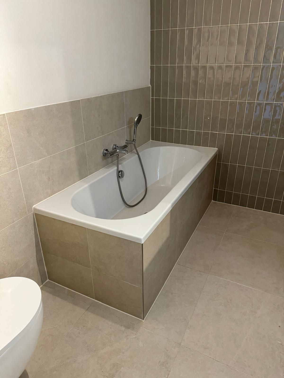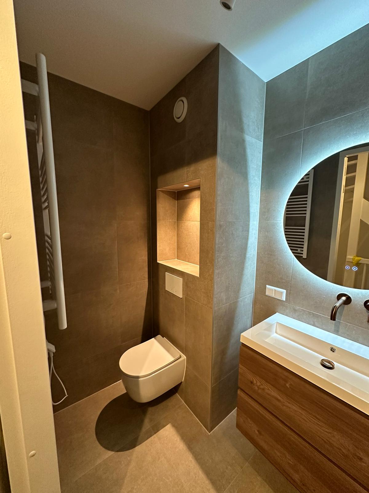 De nieuwe badkamer bestaat uit een combinatie van warme aardetinten en moderne materialen. Er is gekozen voor een hangtoilet, een vrijstaand bad en een maatwerk wastafelmeubel met houtstructuur. De douche en het toilet zijn voorzien van strak afgewerkte inbouwnissen, betegeld met grootformaat wandtegels in een matte afwerking. De verlichting is subtiel weggewerkt en geactiveerd via separate schakelaars. De combinatie van handvorm wandtegels en vlakke vloertegels zorgt voor textuur en rust in het ontwerp. Door onze projectmatige aanpak verliep de renovatie volgens planning en met minimale overlast, ondanks de beperkte ruimte en technische complexiteit van de ruimte.