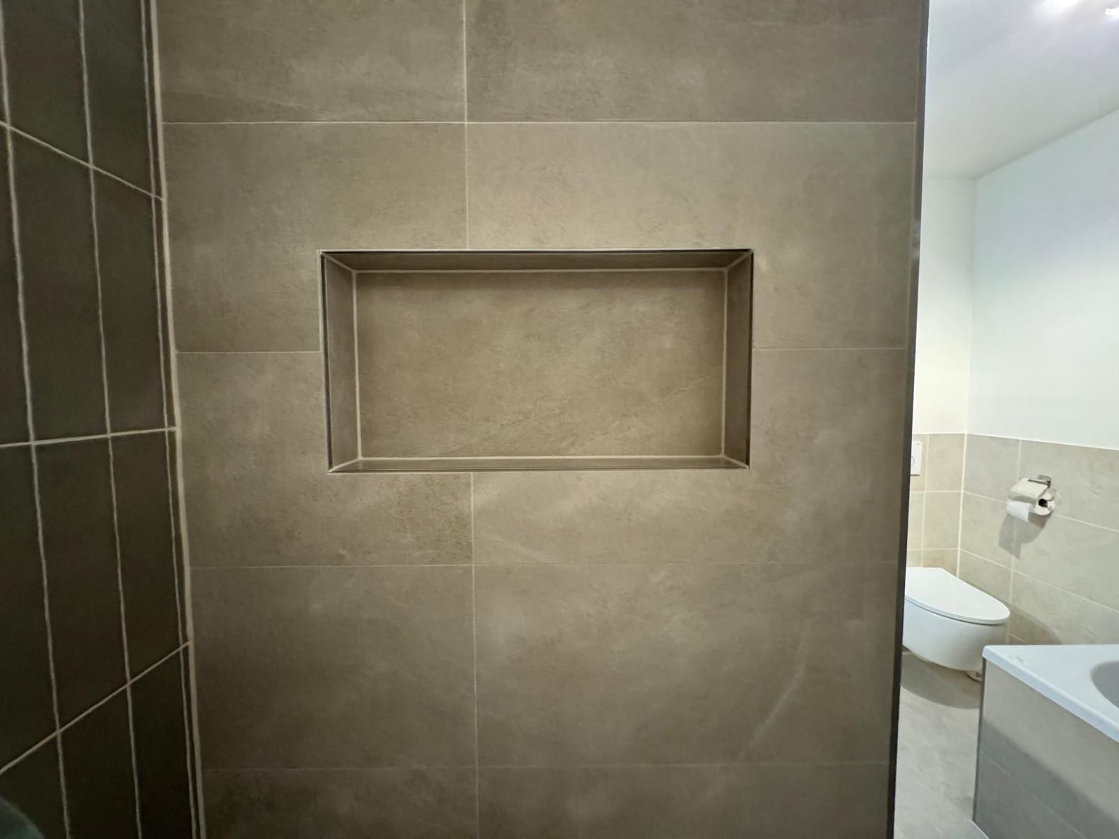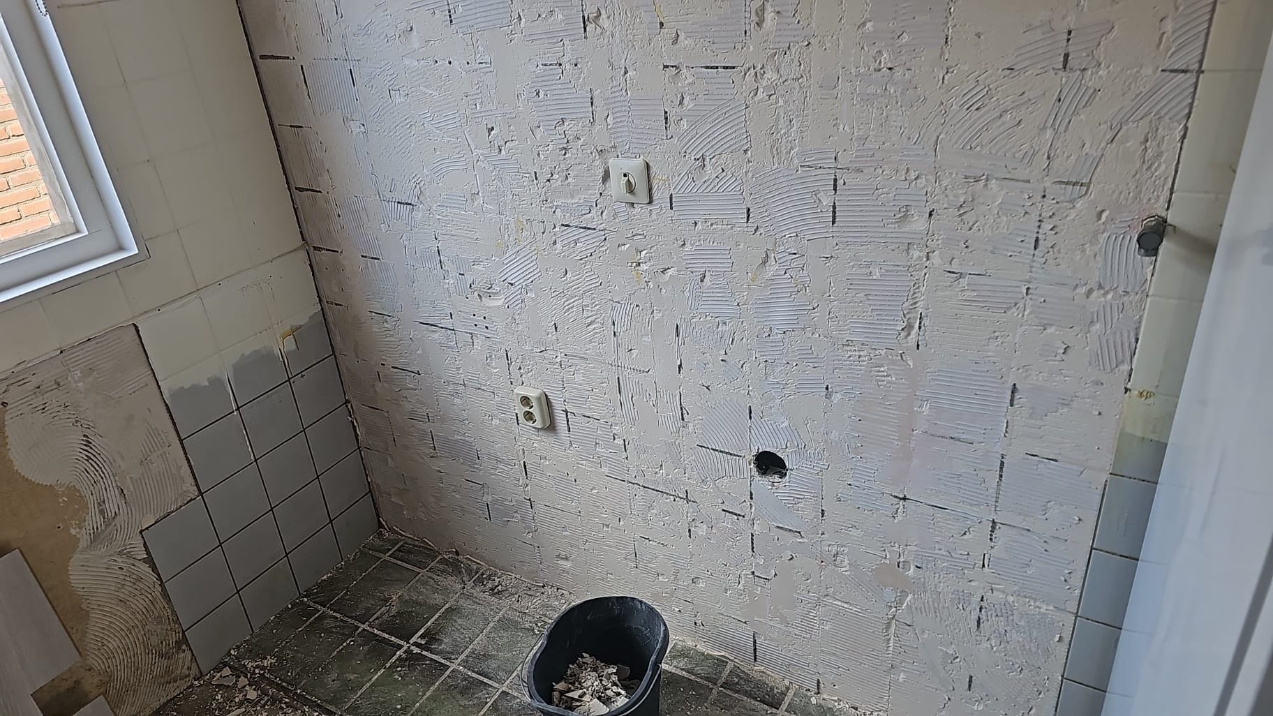 Deze badkamerrenovatie begon met het volledig strippen van de bestaande ruimte. De oorspronkelijke badkamer was gedateerd, met onpraktische indeling en gedateerde tegels. Tijdens de sloopfase werden de wanden volledig teruggebracht tot ruwbouwniveau, waarbij oude tegelresten en lijmlagen handmatig zijn verwijderd. De leidingen voor water, afvoer en ventilatie zijn volledig vervangen en verlegd, zodat de nieuwe indeling strak en logisch kon worden opgebouwd. Alle technische aansluitingen zijn tijdens de ruwbouwfase exact op maat aangebracht, inclusief voorbereidingen voor inbouwkranen, afzuiging en verlichting.